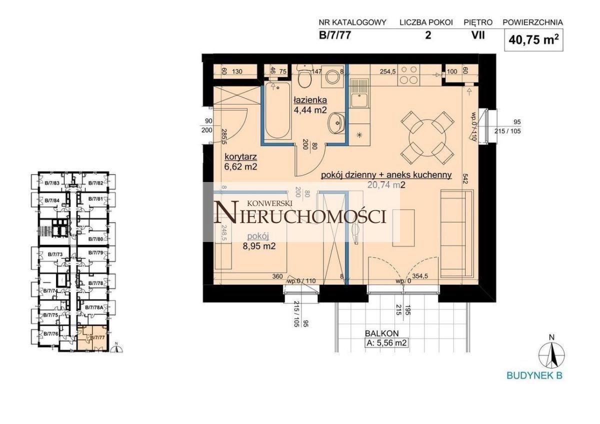 40,75 m2 plus balkon 5,56 m2 od strony południowej. Pokój dzienny z aneksem 20,74 m2 plus sypialnia 8,95 m2. Mieszkanie znajduje się na 7 piętrze w 11-o piętrowym budynku. Oczywiście w budynku jest winda. Obecnie istnie jeszcze możliwość zakupienia mieszkania o takim samym lub podobnym układzie również na innej kondygnacji, w zależności od tego czy ktoś woli piętra wyższe czy niższe.