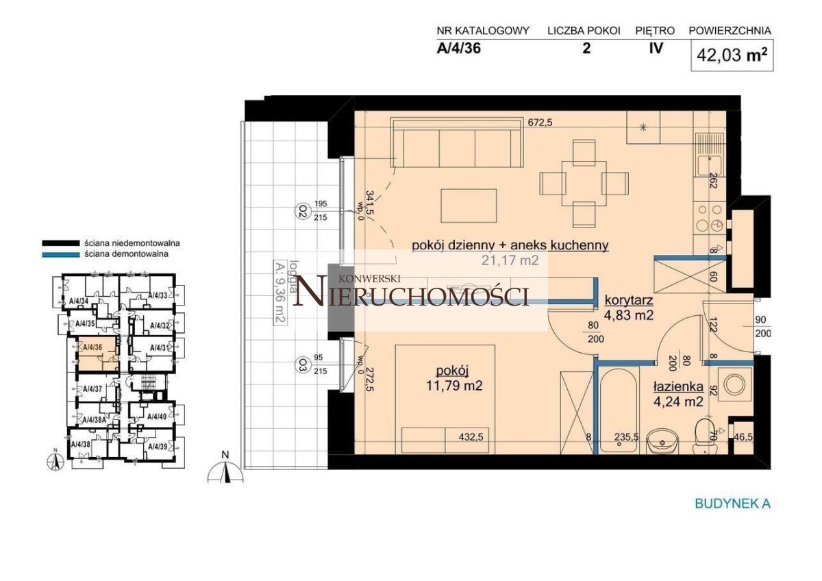 42,03 m2 plus duży balkon 9,36 m2 od strony zachodniej. Pokój dzienny z aneksem 21,17 m2 plus sypialnia 11,79 m2. Mieszkanie znajduje się na 4 piętrze w 8-o piętrowym budynku. Oczywiście w budynku jest winda. Obecnie istnieje jeszcze możliwość zakupienia mieszkania o takim samym lub podobnym układzie również na innej kondygnacji, w zależności od tego czy ktoś woli piętra wyższe czy niższe.